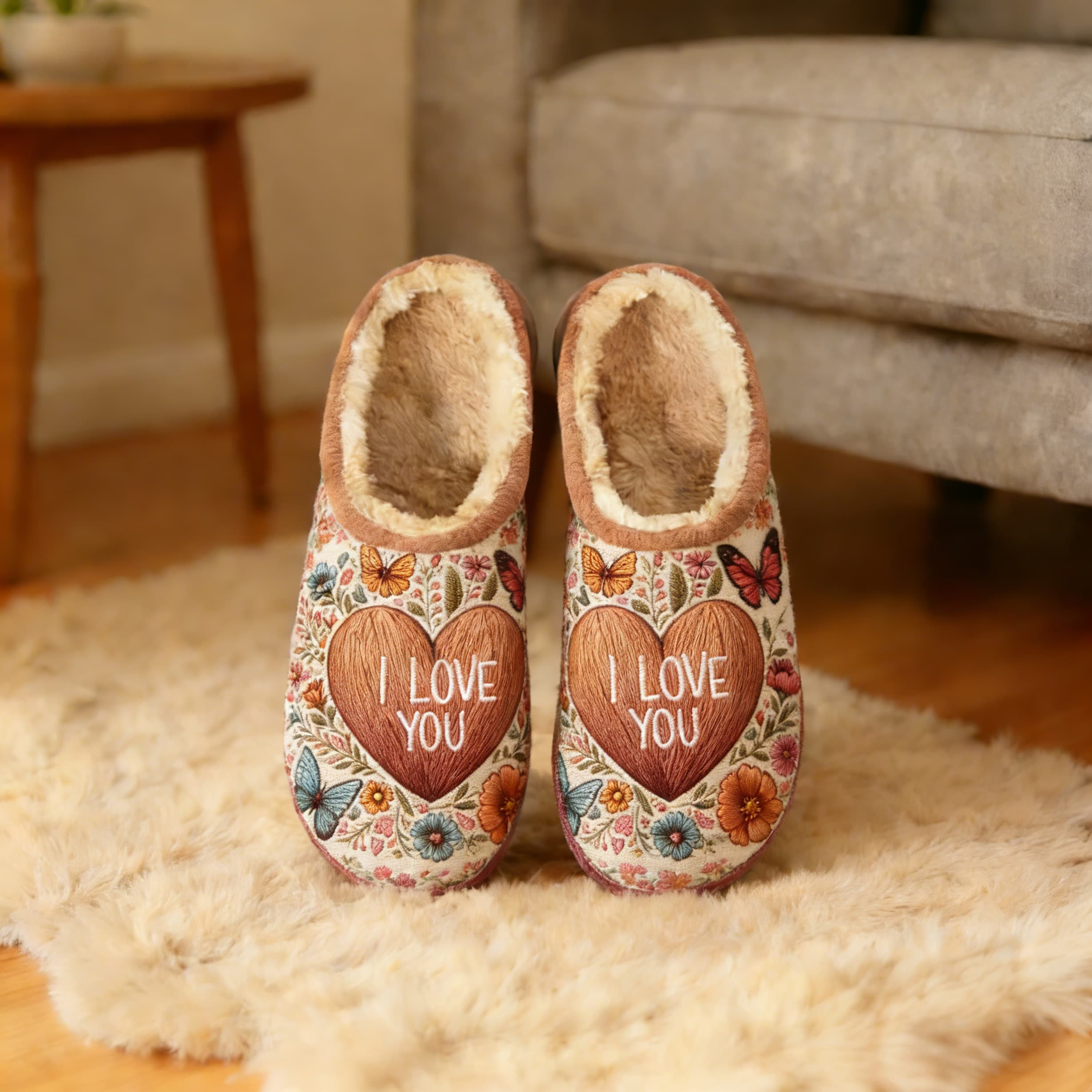 Brown Floral "I Love You" Heart Embroidery Plush Printed Slippers