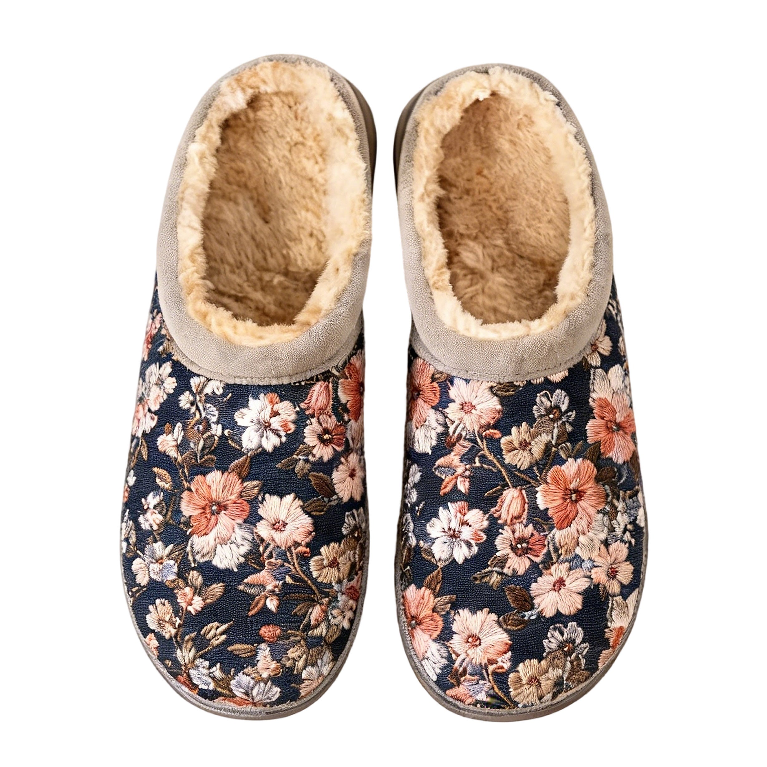 Navy Vintage Floral Embroidery Plush Printed Slippers