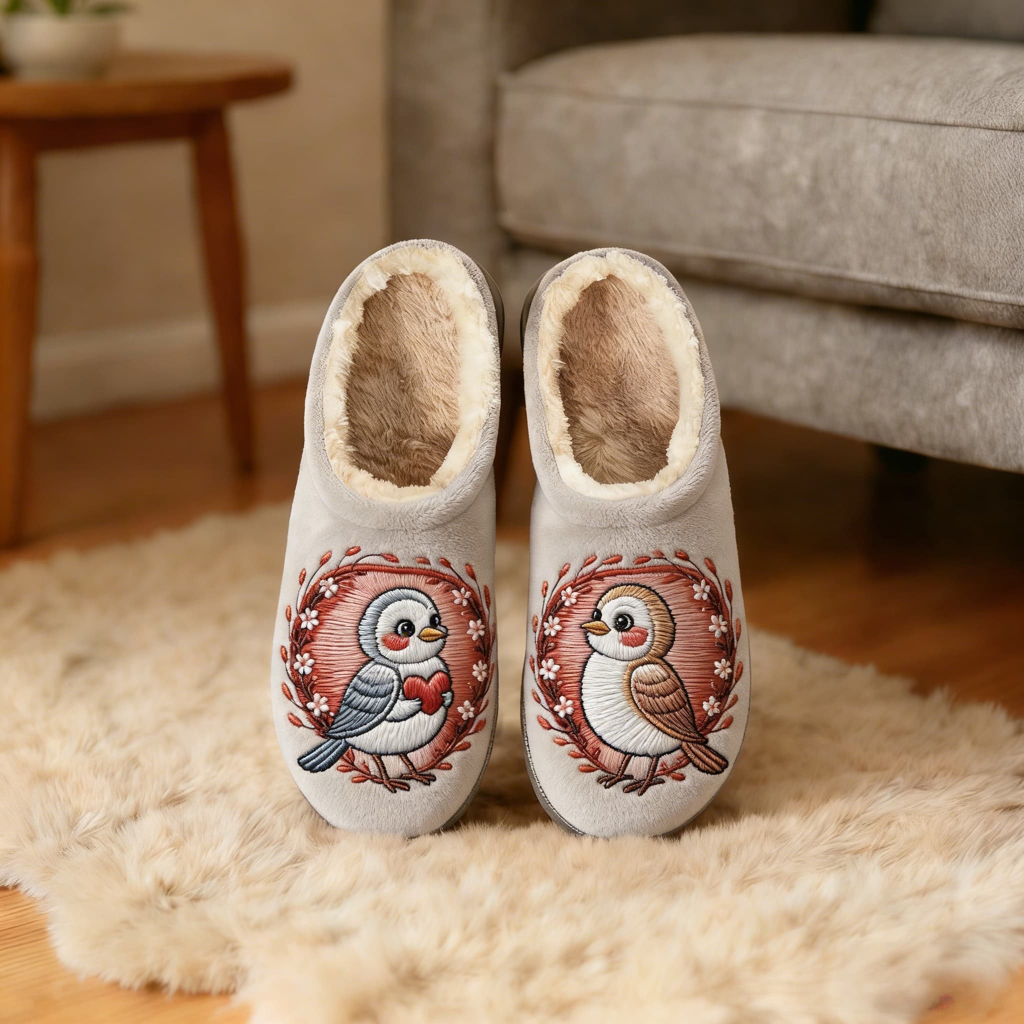 Neutral Tone Love Bird Couple Embroidery Plush Printed Slippers