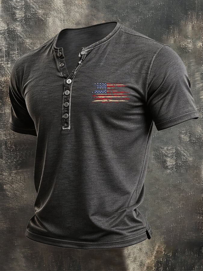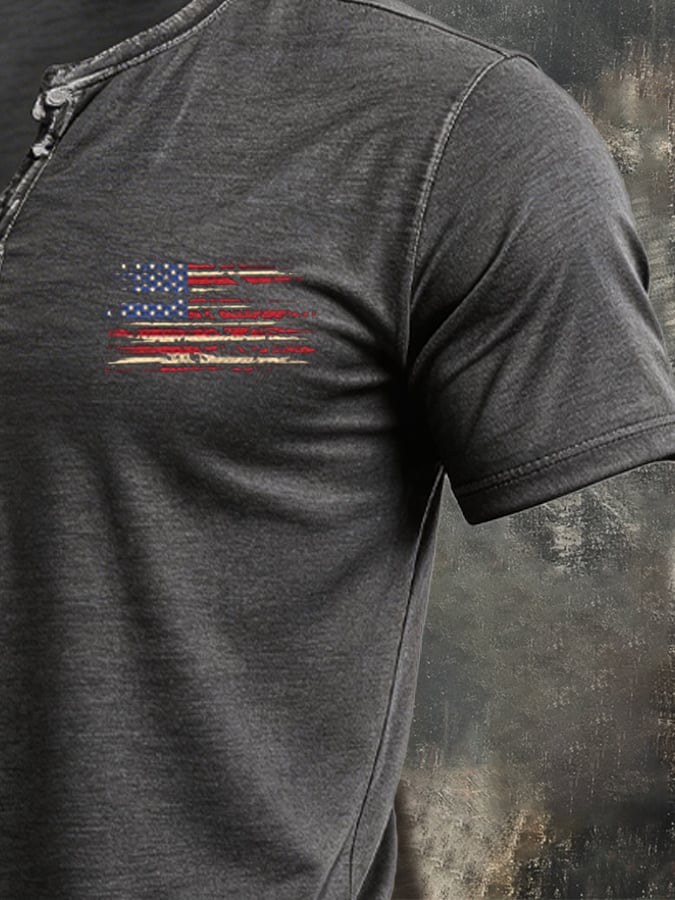 Men'S Retro Pure Cotton Washed Distressed Color-Blocked Henley Collar Short-Sleeve Top$39.69 USD$77.73 USD