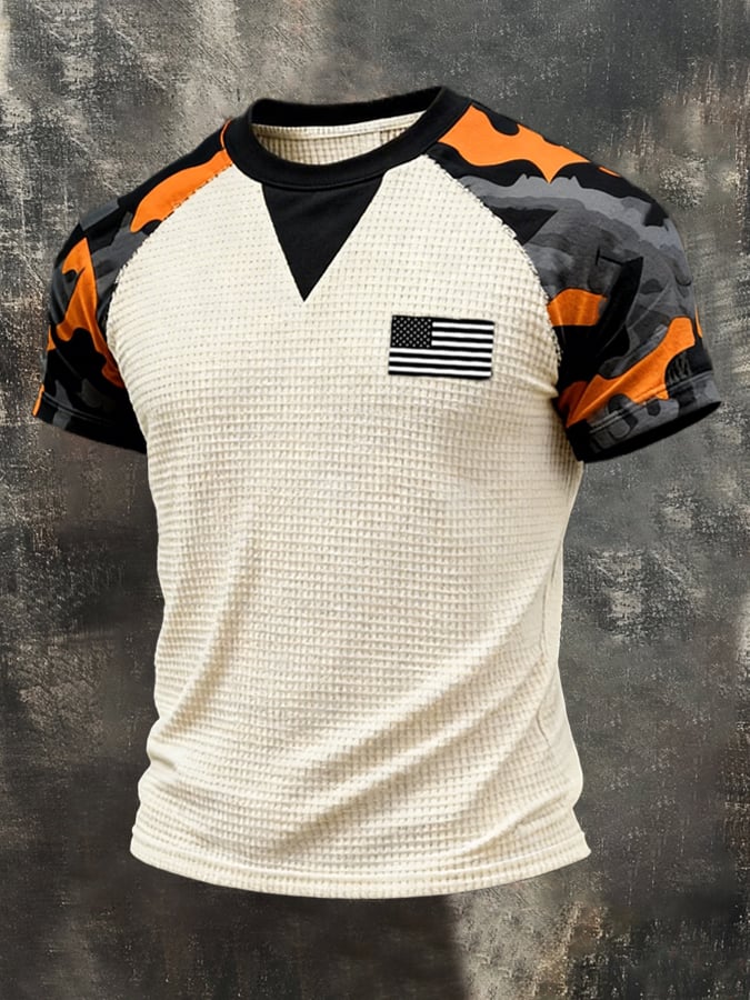 Men's Retro Camouflage Patchwork Waffle Knit Short-Sleeve T-Shirt$24.99 USD$46.94 USD