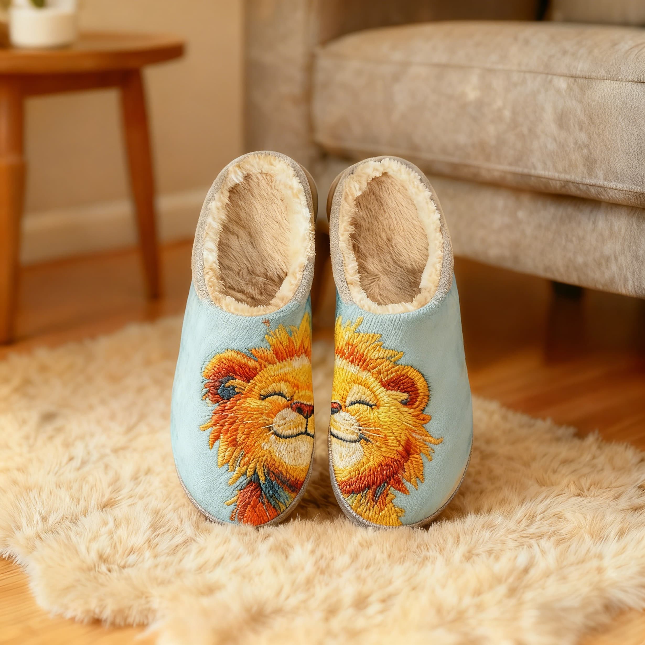 Light Blue Smiling Lion Embroidery Plush Printed Slippers