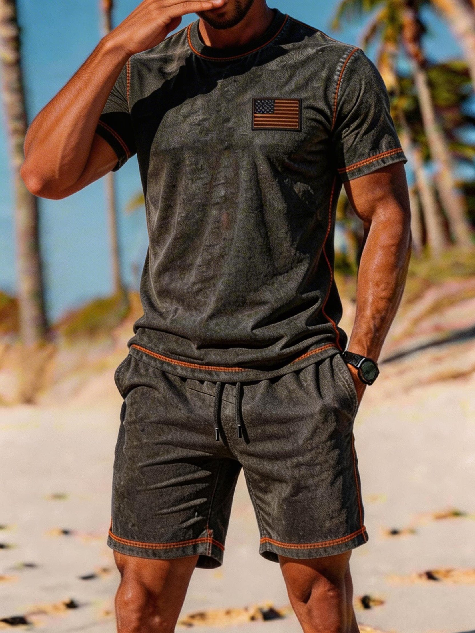 Men's Casual & Athletic Basic Distressed Vintage-Wash Printed "Patriot" Shorts and Short-Sleeve T-Shirt Set