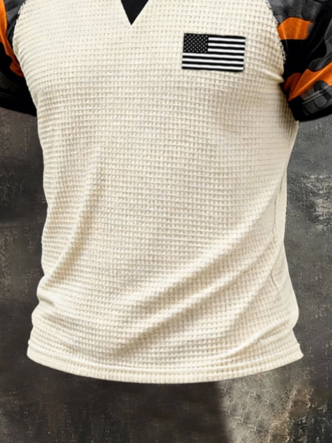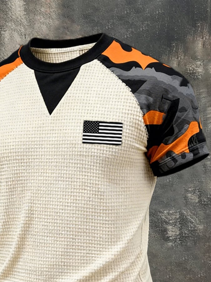 Men's Retro Camouflage Patchwork Waffle Knit Short-Sleeve T-Shirt