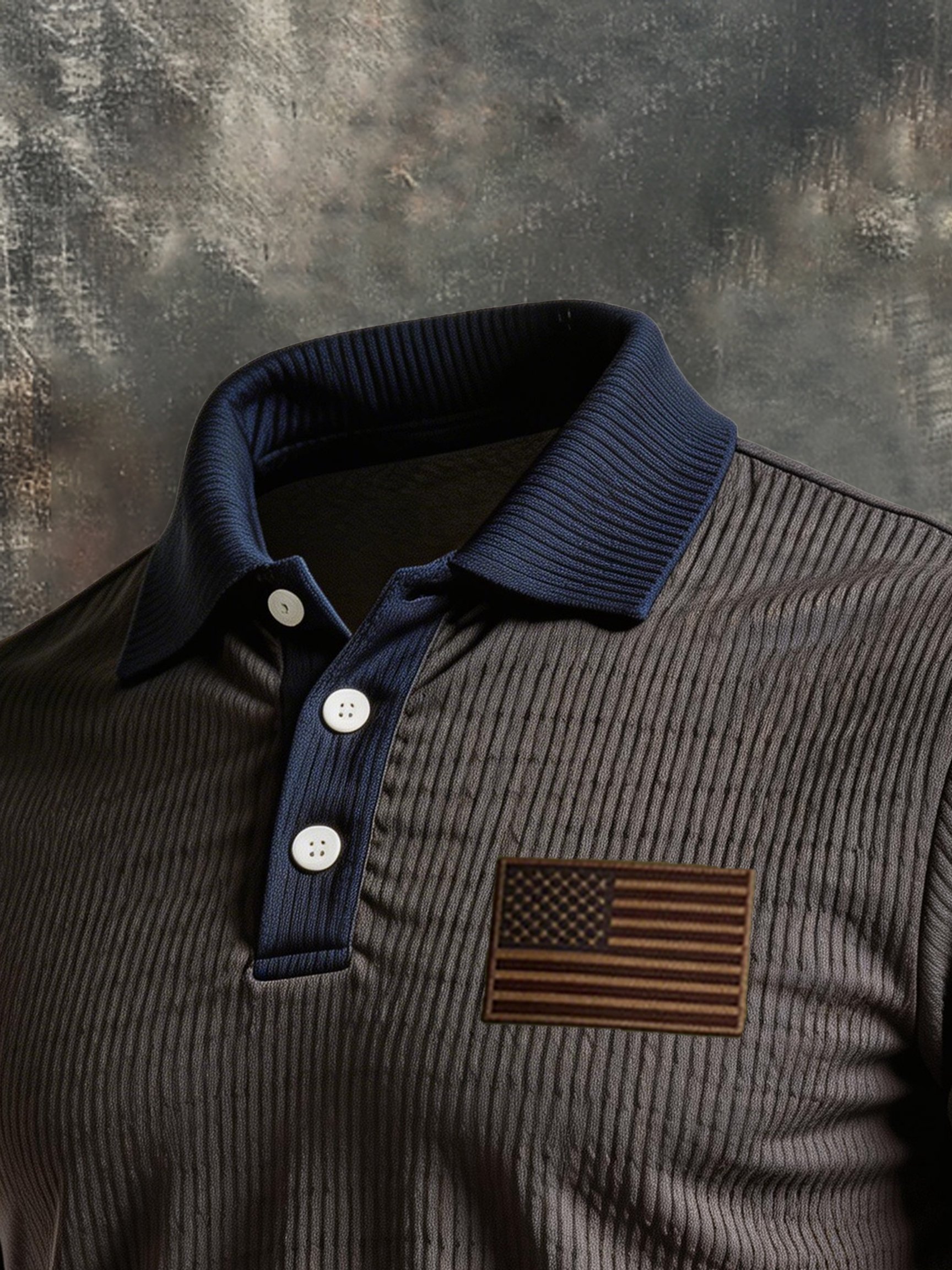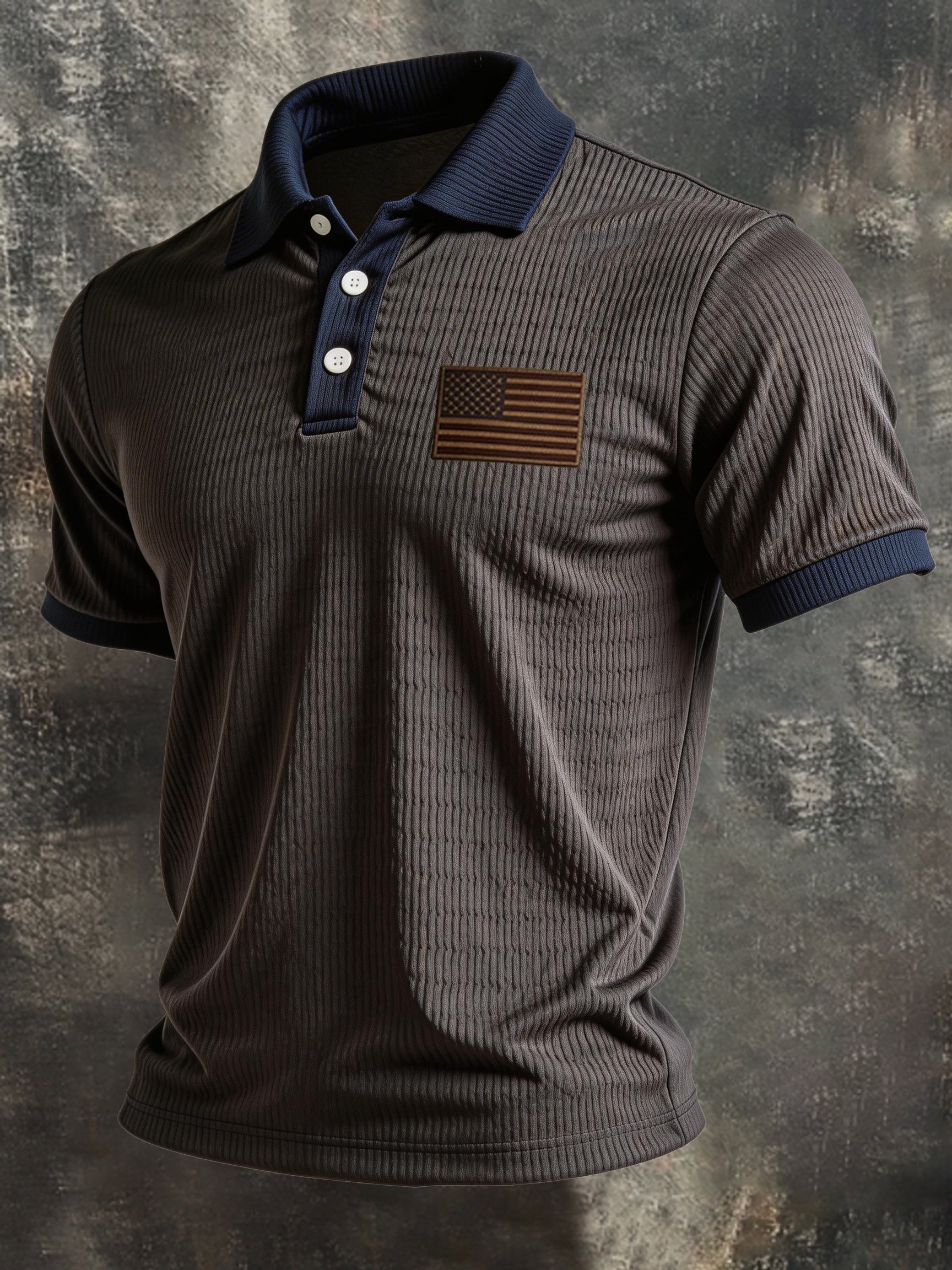 Men's Retro "Patriot" Textured Fabric Short-Sleeve T-Shirt with Contrast Polo Collar