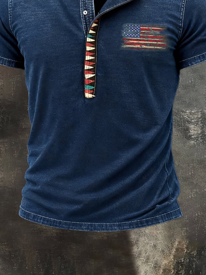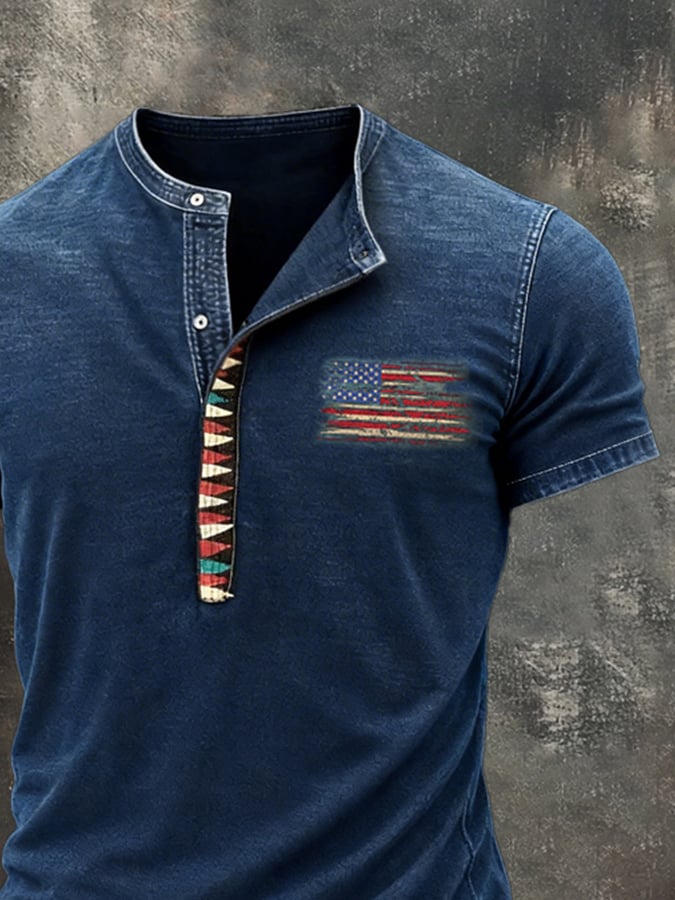 Men'S Retro Pure Cotton Washed Distressed Color-Blocked Henley Collar Short-Sleeve Top