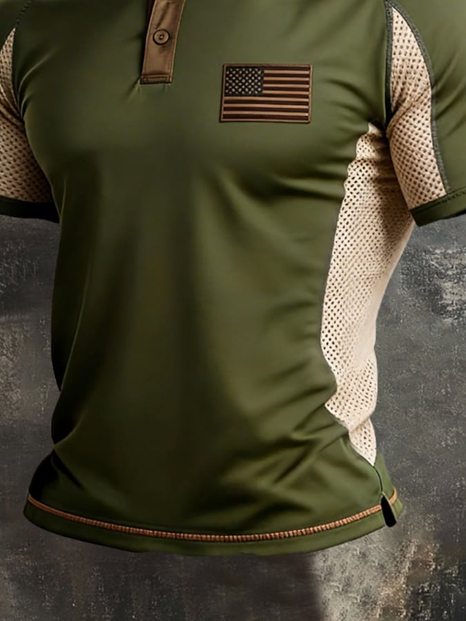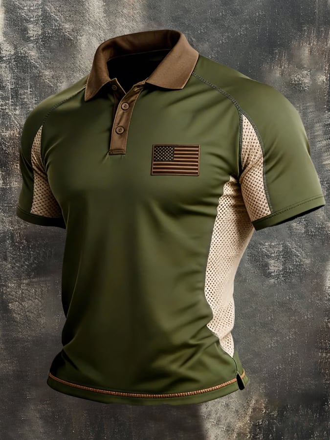Men's Retro Spliced ​​Breathable Mesh "Patriot" Polo-Collar Casual T-Shirt