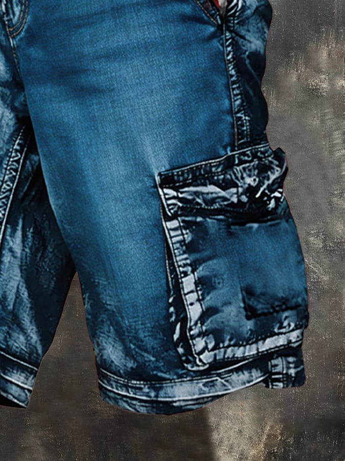 Patriot Retro Outdoor Functional Washed Distressed Denim Shorts